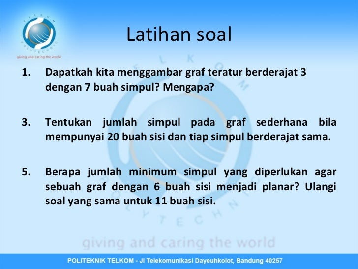 Beberapa soal diambil dari bahan ajar dosen dan sisanya diambil dari. Dari graf soal nomor 1 dan tentukan bobot nya! Welcome to my facebook page. Soal graf berarah (kelompok 2) sebutkan simpul yang terkandung dalam graf berarah diatas! Ini tidak planar, karena graf tersebut mengandung sebuah subgraf yang homeomorfik pada k5.