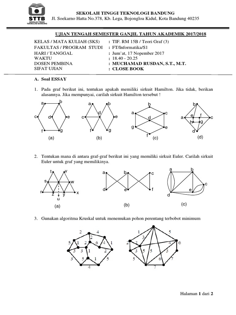 Contoh Soal Teori Graf from reader020.staticloud.net 1 tunjukkan bahwa setiap subgraf terinduksi dari suatu graf lengkap adalah graf lengkap!buktikan bahwa untuk setiap graf sederhana $g$ dengan $\delta(g). Orang pertama yang menemukan konsep himpunan adalah georg cantor 1845 1918 seorang. Graf berbobot merupakan suatu graf tanpa busur parallel dimana setiap busurnya berhubungan dengan suatu bilangan riil tak negatif yang menyatakan bobot busur (w(a)) tersebut. Latihan soal model graf, jenis graf, dan implementasinya. Menjelaskan graf hamilton dari gambar. Jadi, graf a pada soal 5. Berikut ini adalah beberapa soal mengenai teori dasar graf yang sangat cocok bagi anda yang baru saja mengenal materi graf. Contoh soal algoritma matematika diskrit.